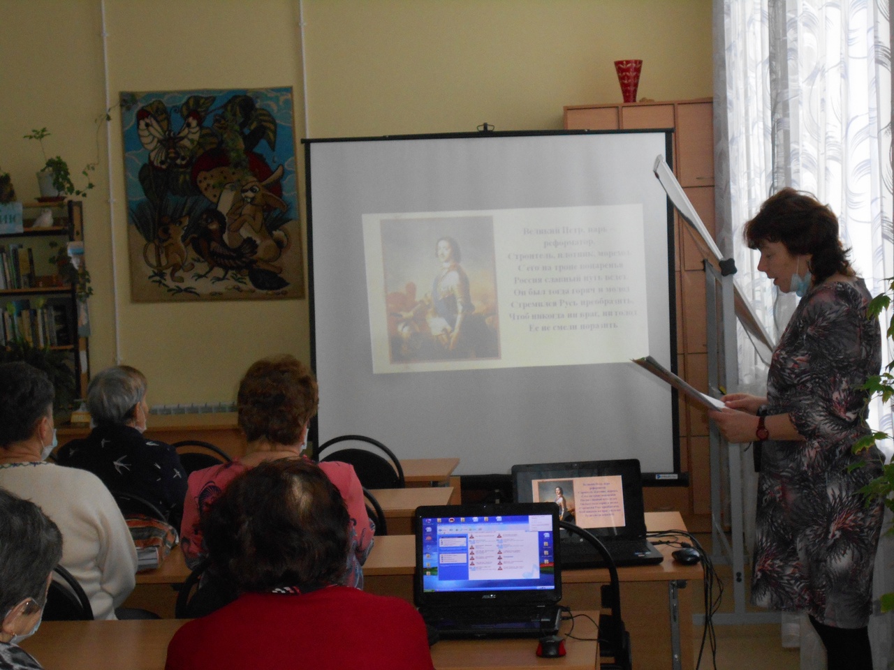Для граждан пожилого возраста центра активного долголетия «Забота» 16 февраля библиотекарь Кирилловской центральной районной библиотеки Фролова Юлия Васильевна подготовила историческое досье: «То академик, то герой, то мореплаватель, то плотник». Мероприятие способствовало получению исторических знаний и интересных фактов о личности Петра 1.
