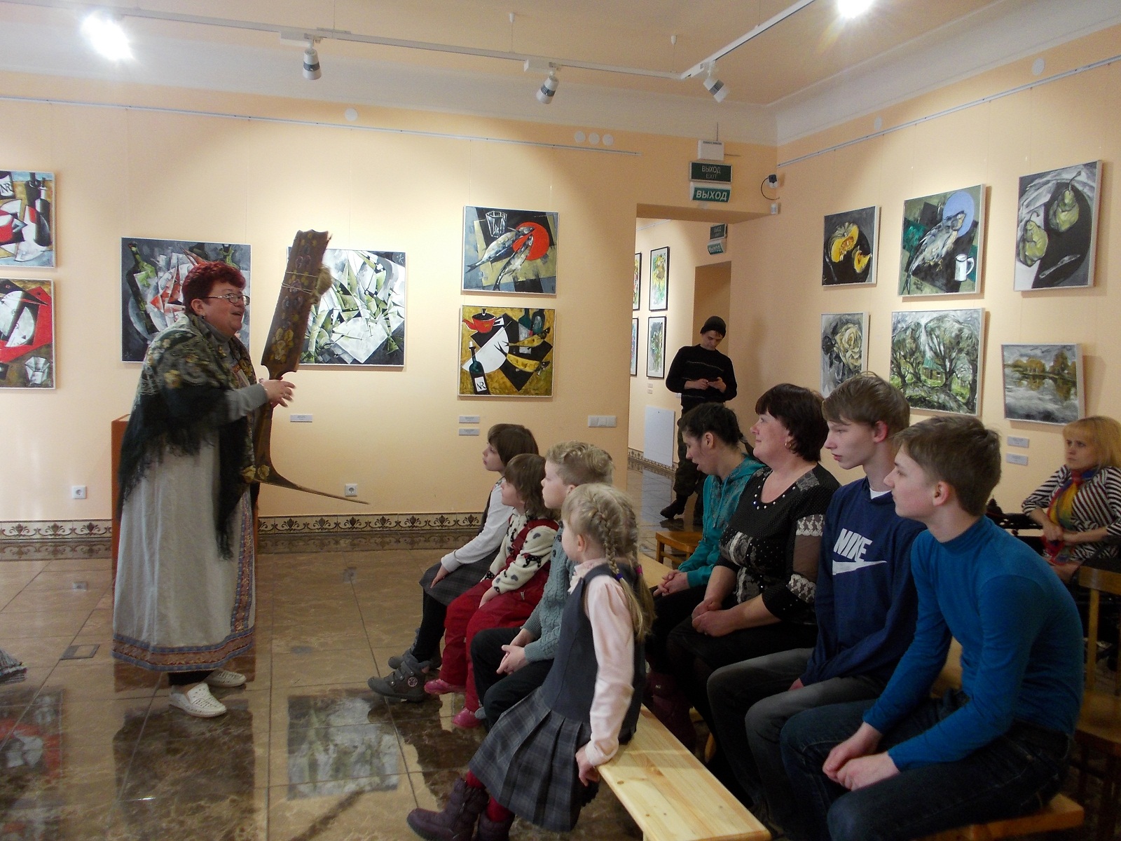 Марина Николаевна предложила детям совершить путешествие в мир картин. Холсты некоторых картин настолько велики, что натягивать их приходилось целой командой сотрудников музея. Она обратила внимание на картины с изображением животных, птиц, природы. Присутствующие на мероприятии, смотрели на живопись с интересом и восхищались разнообразием красок. Завершилась экскурсия просмотром кукольного спектакля «Гуси лебеди».