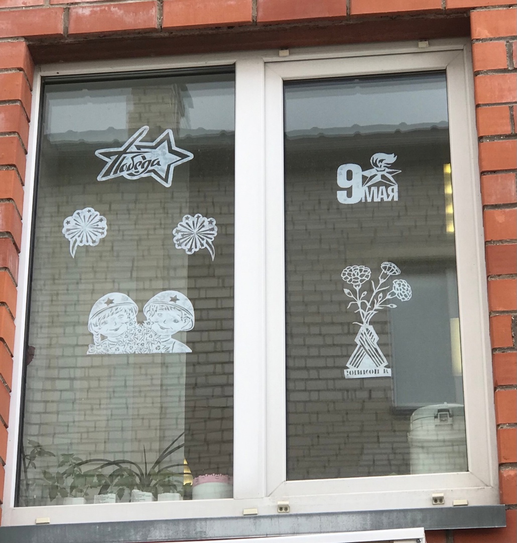 Окна учреждения украшены Победной символикой и напоминают о героизме русского народа, о тех великих победных днях и сохранении памяти.