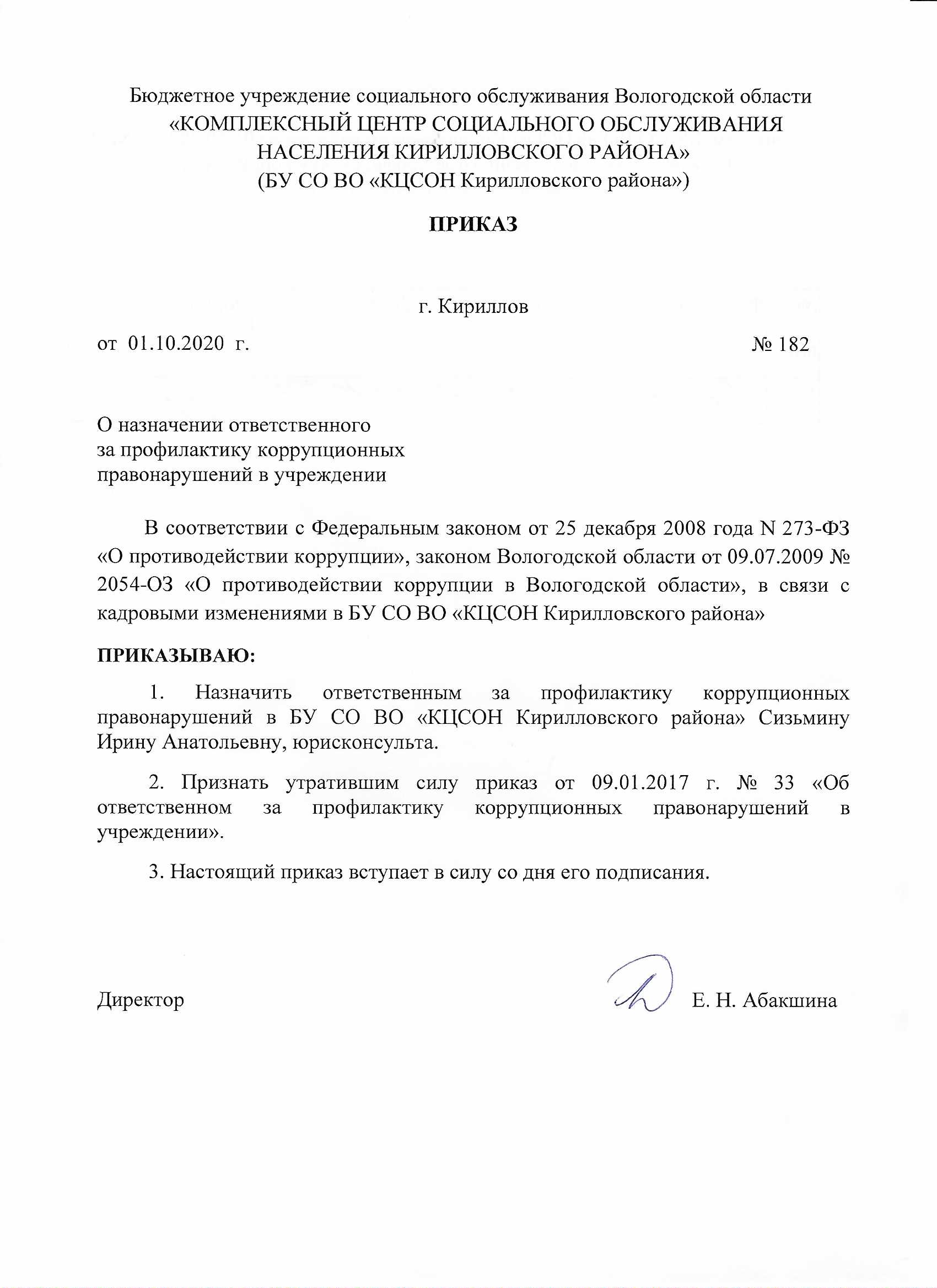 В БУ СО ВО "КЦСОН Кирилловского района" лицом, ответственным за профилактику коррупционных правонарушений, с 07.11.2023 года назначена Кузнецова Оксана Николаевна, юрисконсульт, телефон 8(81757) 3-23-09csonkirillov.gov35.ru/upload/iblock/47b/hs3r63lujuiauzxbrm6gvtxfsr5dph2b/Otvetstvennyy-po-korruptsii.pdf