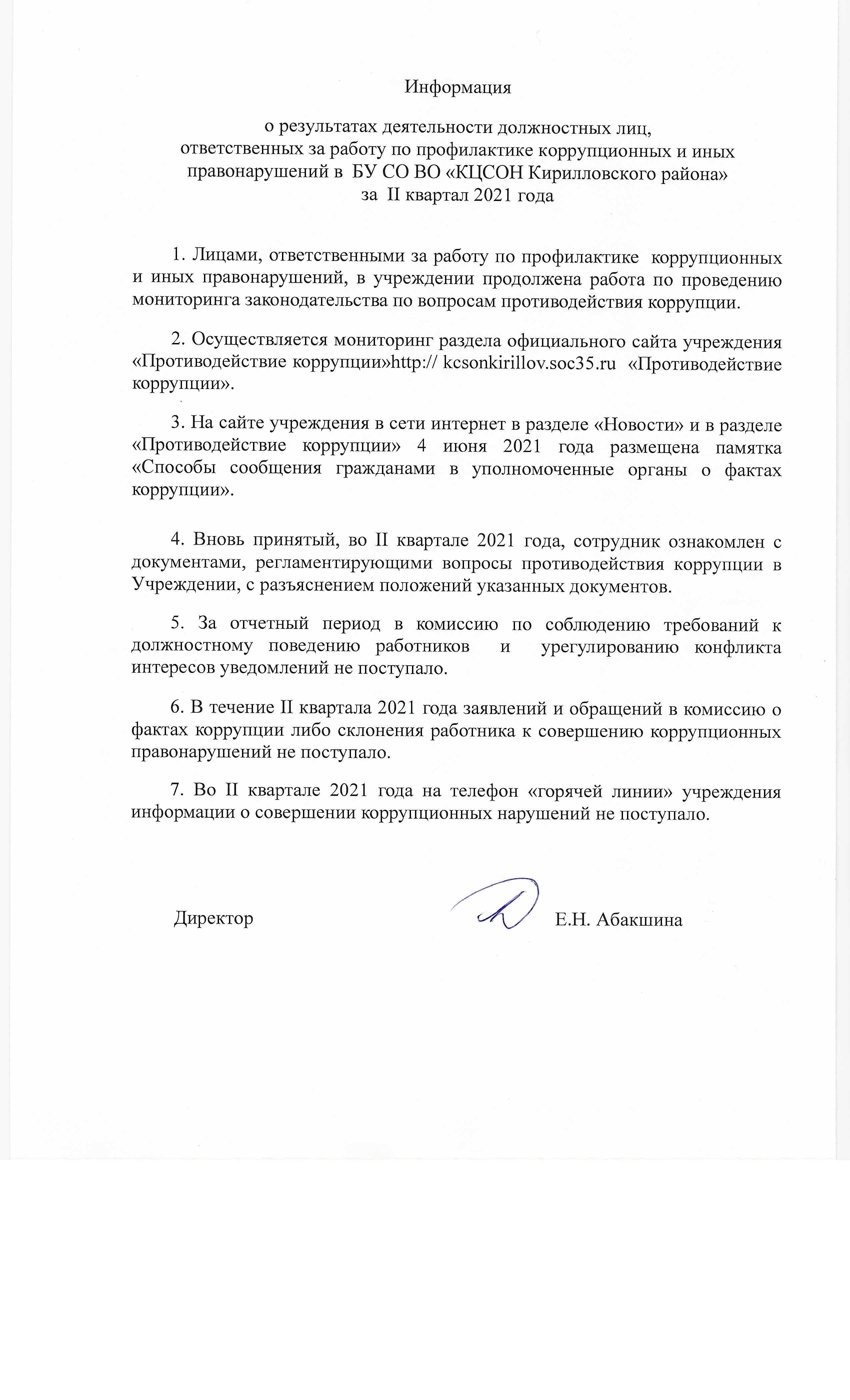 Информация о результатах деятельности должностных лиц, ответственных за работу по профилактике коррупционных правонарушений в БУ СО ВО «КЦСОН Кирилловского района» за II квартал 2021 года
